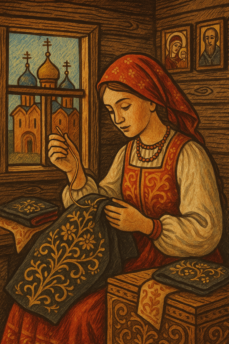 Как нитью из золота украшали иконы, сарафаны и свадьбы — и зачем в каждом стежке была молитва Когда в старину в избе зажигалась лампада, а бабушка доставала сундук, то среди лоскутов, кружев и ниток всегда лежала тонкая ткань с золотыми искрами. Это было золотное шитьё — не просто украшение, а знак веры, красоты и защиты. Его передавали из рода в род, берегли и создавали с благоговением. Сегодня расскажем, как золотая нить превратилась в символ женского мастерства, откуда пошло искусство золотного шитья, и почему оно до сих пор звучит как тёплый звон в ладонях истории. Корни золотного шитья — в Суздале, Ростове Великом, Москве, Смоленске. Уже в XII веке монастыри имели мастерские, где золотыми и серебряными нитями вышивали оклады икон, риз, покровцы, пояса, а позже — праздничные наряды боярынь. Особенно ценилось смоленское шитьё — его использовали для украшения икон Богоматери Одигитрии, которую почитали как покровительницу всей Руси. Нити делали из спиралек тонкого золота, накрученног