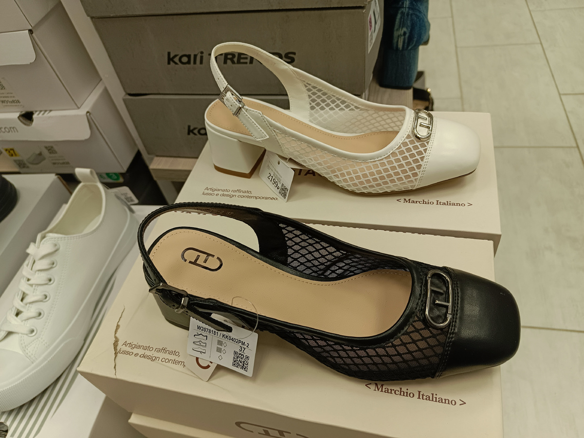 В настоящее время меня интересует ассортимент продукции, поступившей в продажу в магазине Kari за последнюю неделю. В частности, я хотела бы обратить внимание на наличие летней обуви, включая босоножки, сандалии и туфли. Во время последнего посещения магазина я отметила значительное расширение ассортимента обуви, предназначенной для нас красивых. Однако на текущий момент все товары представлены без применения скидок и по завышенным ценам. Лёгкие босоножки на среднем каблуке с закрытым носком и сеточкой, присутствует небольшой декор на носке. Цена 2199 рублей. Чёрные шлёпанцы на тонкой подошве украшенные орнаментом из страз. Цена 1999 рублей. Двухцветные босоножки на танкетке с перехлёстом на подъёме. Цена 2399 рублей. Красные лакированные босоножки на среднем каблуке с закрытым носком. Цена 2199 рублей. Серебристые босоножки на декоративном тонком каблуке. Цена 2199 рублей. Босоножки леопардового цвета на шпильках. Цена 2199 рублей. Босоножки представляют собой оригинальную модель, отл