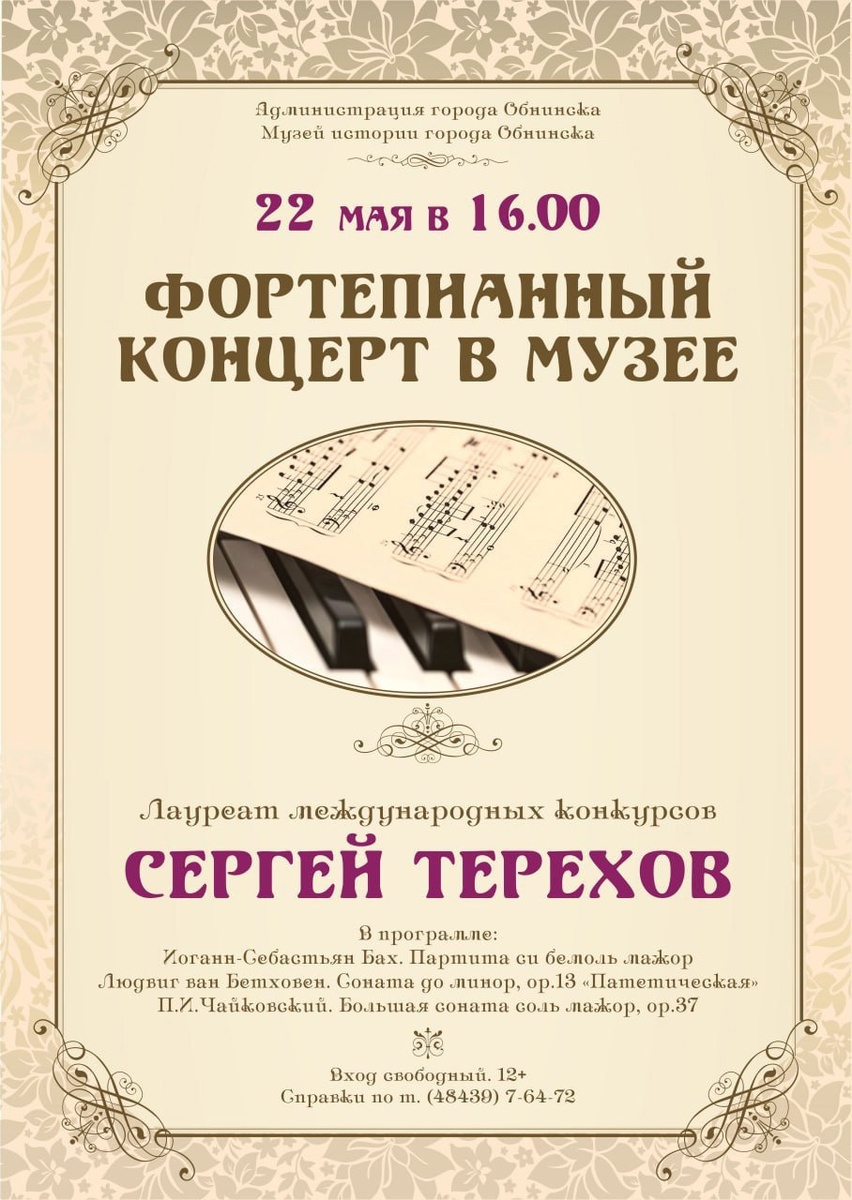 🎶22 мая в 16:00 в Музее истории города Обнинска состоится фортепианный концерт Сергея Терехова. Сергей Дмитриевич Терехов — правнук Виктора Петровича Обнинского — последний владелец усадьбы Белкино, создатель усадьбы Турлики-Михайловское (Морозовская дача).