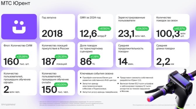 На рынке кикшеринга может появиться новый лидер Российский рынок кикшеринга стремительно растёт: в 2024 году его объём увеличился на 40%, а крупнейшие игроки — Whoosh, МТС Юрент и Яндекс — контролируют практически 100% рынка (при этом в деньгах клиентов доля Whoosh и Юрент более 80%). 👉По прогнозам Трушеринга потенциал роста рынка еще очень большой, агентство ожидает рост на 30% в 2025 году за счет увеличения количества поездок и выручки с одного пользователя - собственно, этот тренд работал все последние годы. 👉Ключевым фактором развития на рынке становится экосистемность. Так, например, из интервью гендиректора Юрент Ивана Туринга можно узнать о результатах второго по значимости игрока. Рост поездок составил более чем на 60%, обгоняя среднерыночные темпы в 40% (напомню, что у крупнейшего Вуша было +33%). Пробили 100 млн поездок за год. Юрент растет по выручке гораздо быстрее конкурентов, и уже прямо наступает на пятки крупнейшему игроку по доле рынка в деньгах (12 млрд руб. об