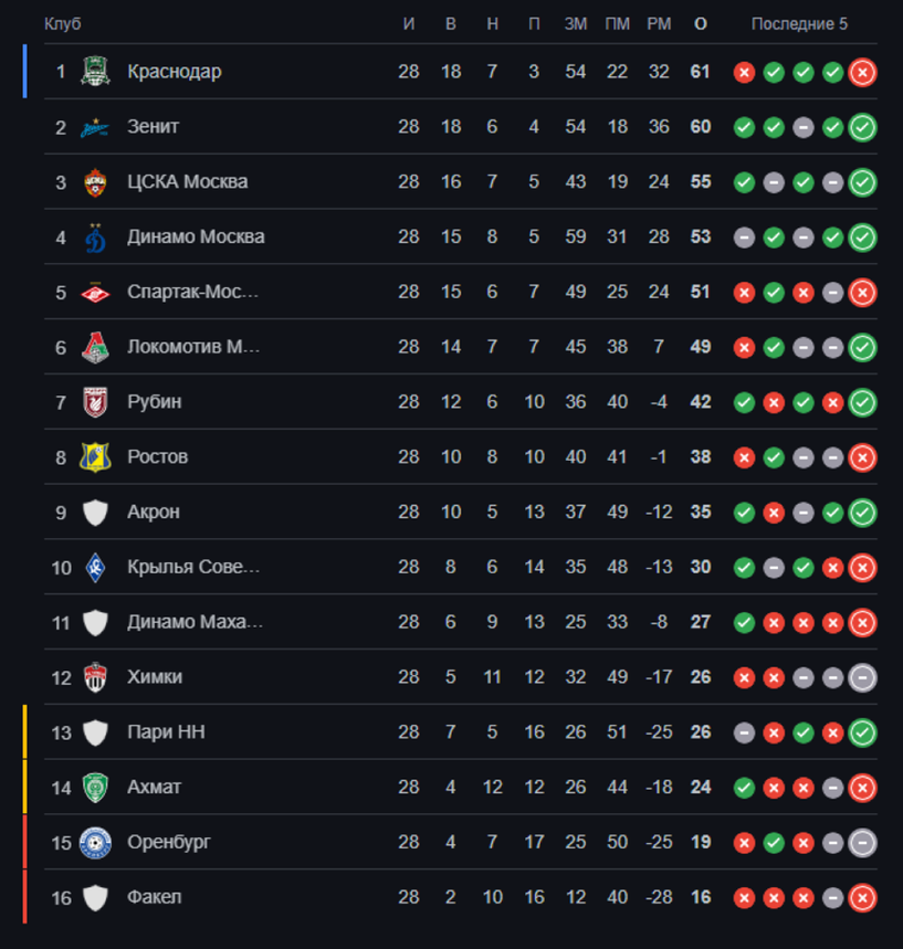 В российских чемпионатах действует система выбывания и повышения в классе. Есть Российская Премьер-лига (РПЛ) — главный чемпионат в стране, и Первая лига (ФНЛ) — второй по значимости дивизион. В конце каждого сезона подводят итоги: команды, занявшие в РПЛ два последних места в таблице, покидают высший дивизион, а клубы, занявшие два первых места в ФНЛ — поднимаются в РПЛ. Еще есть зона стыковых матчей: клубы, которые заняли 13–14-е место в РПЛ, должны будут сыграть с командами 3–4-го места в ФНЛ. Кто побеждает, тот и сыграет в высшем дивизионе в следующем сезоне. Из РПЛ вылетят напрямую «Факел» и, скорее всего, «Оренбург». «Ахмат» и «Пари НН» — в зоне стыковых матчей. «Химки» и «Динамо Махачкала» еще не обезопасили себя. За два тура до конца чемпионата в высший дивизион напрямую поднимется «Балтика». Отличные шансы имеет «Торпедо». «Черноморец» и «Сочи» — в зоне стыковых матчей. «Урал» — пятый, имеет самые низкие шансы на возвращение в РПЛ. Сразу три не связанных друг с другом источник