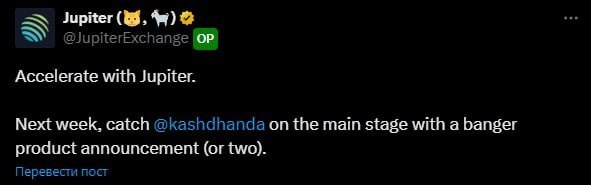 🤑 Jupiter интригует Команда проекта анонсировала, что на следующей неделе состоится анонс одного или даже двух новых продуктов. На цену токена JUP это пока особо не повлияло, но ощущается, что $0,50 — это дешево для проекта, который: зарабатывает на основных комиссиях в сети Solana, активно билдит новые продукты и выкупает свои токены Что думаете? 🧐