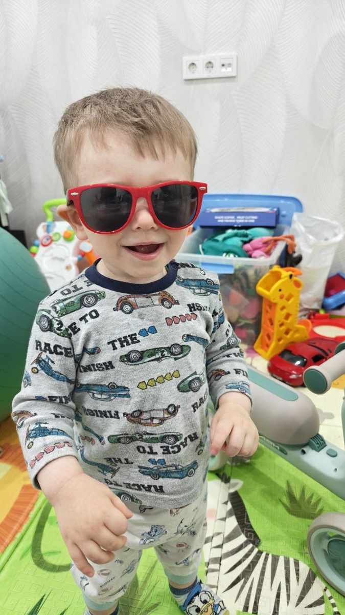 Модный малыш. Мы готовимся к поездке на море и Марк тоже смотрит на нас и копирует. 😂Нашёл Лизы детские очки, примеряет. 🤭💥
