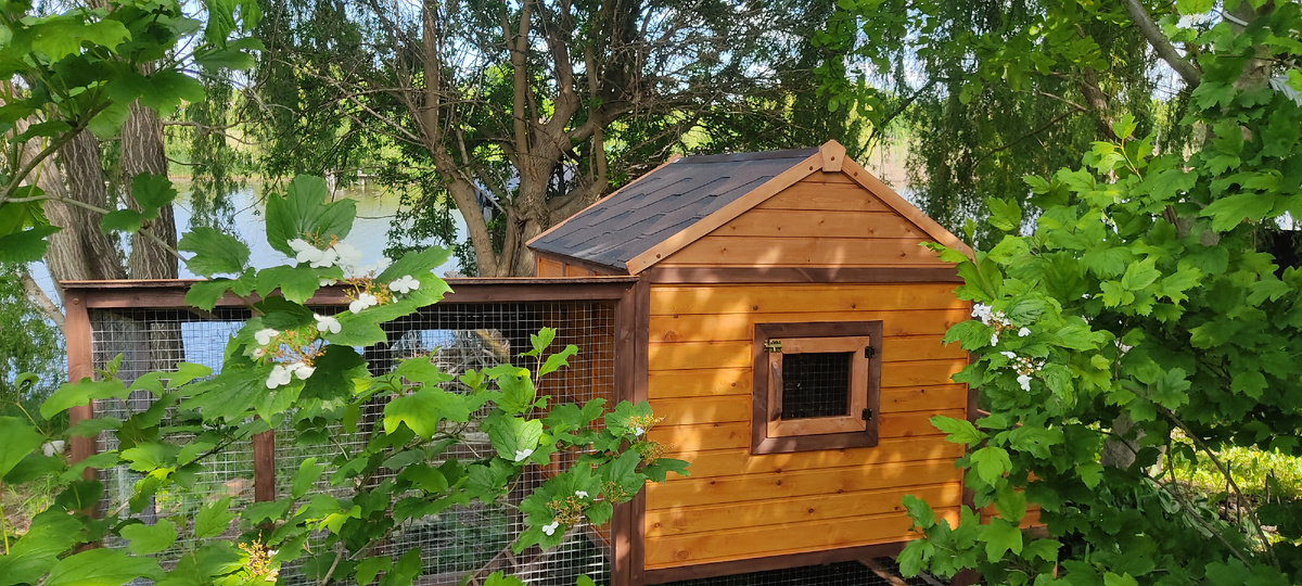 Обещанный через две недели мастером курятник наконец-таки приехал почти через два месяца. Хорошо, что я к назначенному заранее сроку изготовления, курей не купила. Вот был бы номер! Вчера грузчики отнесли его по частям в конец участка и собрали. Курятник получился красивый. Маленький домик с окошком, выдвижным поддоном для уборки мусора и дверцей. Сзади короб с крышкой с четырьмя секциями для гнезд. Небольшой вольер для выгула, лесенка, в домике два насеста. Курятник рассчитан на 15 курей, но я хотела бы сначала завести десять курочек и петуха. Вольер совсем маленький - там особо не разгуляешься, но мы изначально договорились, что это только место для кормления, а выгул будем организовывать самостоятельно, переставляя пластиковую сетку с места на место. А курочки будут мне полоть огород между делом. В Краснодаре сегодня купила кормушку и поилку, которые занимают практически всё пространство возле лесенки. Курятник очень красивый и замечательно вписался в наш сад. Завтра уезжаю в гос
