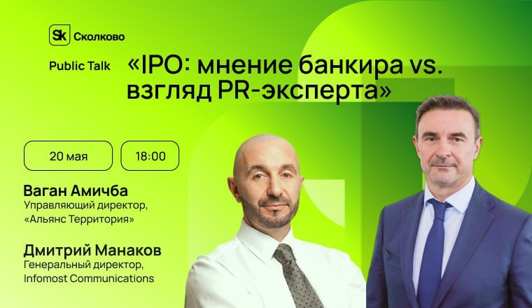 Вебинар «IPO: мнение банкира vs. взгляд PR-эксперта» Выходите на публичный рынок или только планируете IPO? Хотите понять, как завоевать доверие инвесторов и построить успешную коммуникационную стратегию? Тогда велкам 20 мая на горячую онлайн-дискуссию между опытным банкиром и ведущим PR-экспертом, организованную при поддержке Сколково. Что узнаете: 🟢 Какие новые возможности открывает рынок публичного капитала для молодых компаний 🟢 Как устроены сделки и кто участвует в процессе IPO 🟢 Какие этапы подготовки и ключевые вызовы коммуникационного сопровождения 🟢 Как выстроить эффективную «дорожную карту» IR и PR 🟢 Кто такие розничные инвесторы, как с ними работать и почему они важны для успеха размещения Спикеры крутейшие: 🟢 Ваган Амичба, управляющий директор «Альянс Территория» с 20-летним опытом в инвестиционном банкинге и сделках M&A 🟢 Дмитрий Манаков, генеральный директор Infomost Communications, более 30 лет в финансовых коммуникациях, поддержал 40+ IPO/SPO/M&A Словом, ждё