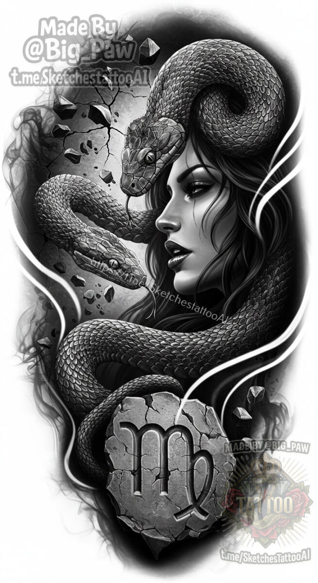#2416 Подборка по запросу подписчика - Знак зодиака дева год змеи для мужчин 🧠 SYNTX 💳 Донат 😎 НейроБро 😎 Эскизы без вотера 💀 Эскизы от нейросети #знакзодиака #дева #змея #эскизы #тату #татуировки