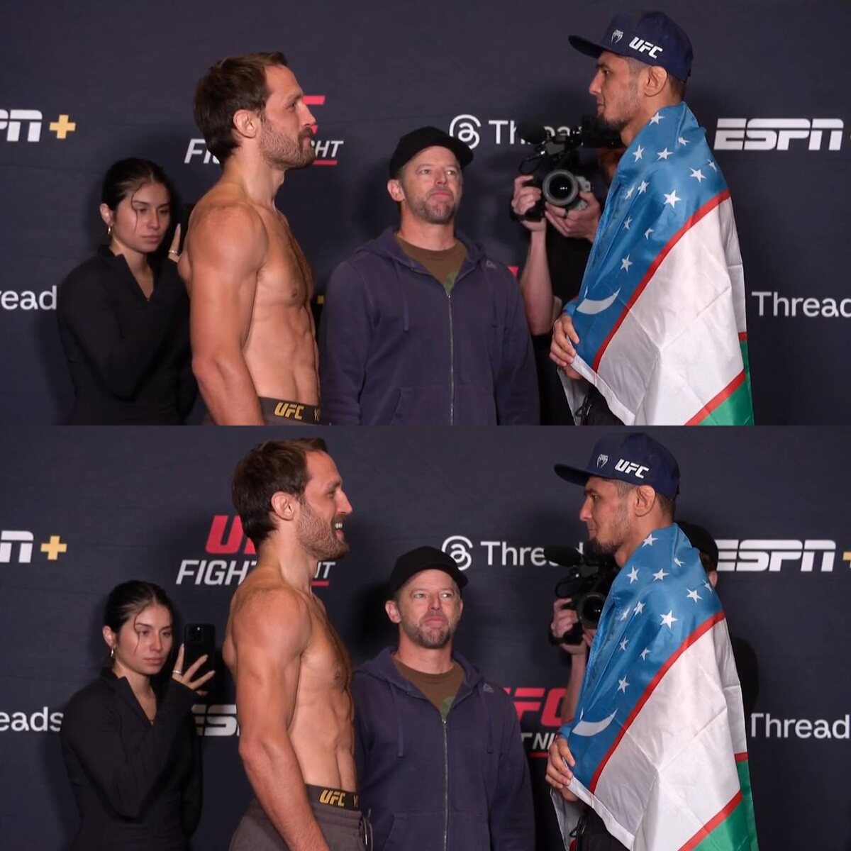 Стольцфус ⚔️ Рузибоев. Парни на позитиве: Дастин поднялся на цыпочки, чтобы сравняться ростом с Нурсултоном. Улыбнусь, пожали руки, разошлись 👏🏻