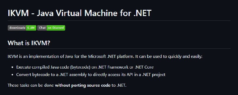 🔮 IKVM — мост между Java и .NET. Инструмент превращает скомпилированные JAR-файлы в .NET-сборки, а также помогает стандартным Java-библиотекам работать как родные для C#.
