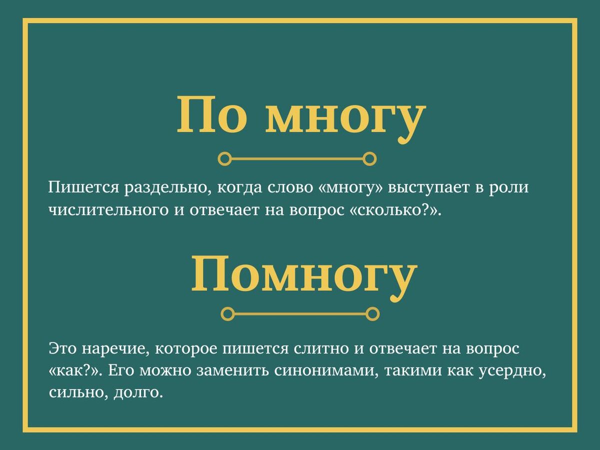🗣️ Правильное употребление «По многу» пишется раздельно, когда слово «многу» выступает в роли числительного и отвечает на вопрос «сколько?» Мы не видим его дома по многу месяцев. «По много» также является синонимом «по многу» и может использоваться в том же значении, если это делает фразу более звучной. «Помногу» — это наречие, которое пишется слитно и отвечает на вопрос «как?». Его можно заменить синонимами, такими как усердно, сильно, долго. Он каждый день помногу работал. #Правильное_употребление MERLIN — Выучите Английский, читая отрывки из книг
