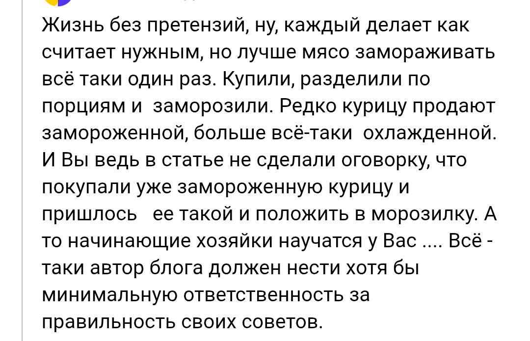 Сразу оговорюсь, что при написании статей у меня нет даже и мыслей по поводу того, что, если я описываю свои какие-то действия, то таким образом я даю вам советы. Например, недавно я разморозила курицу и некоторые её запчасти положила опять в морозилку. Внимательный читатель заметил и написал мне об этом. Конечно, так делать не рекомендуется. Но иногда приходится так поступать. И не только я одна так делаю, похоже. О чëм я и написала в ответе. Получила вот такой комментарий.