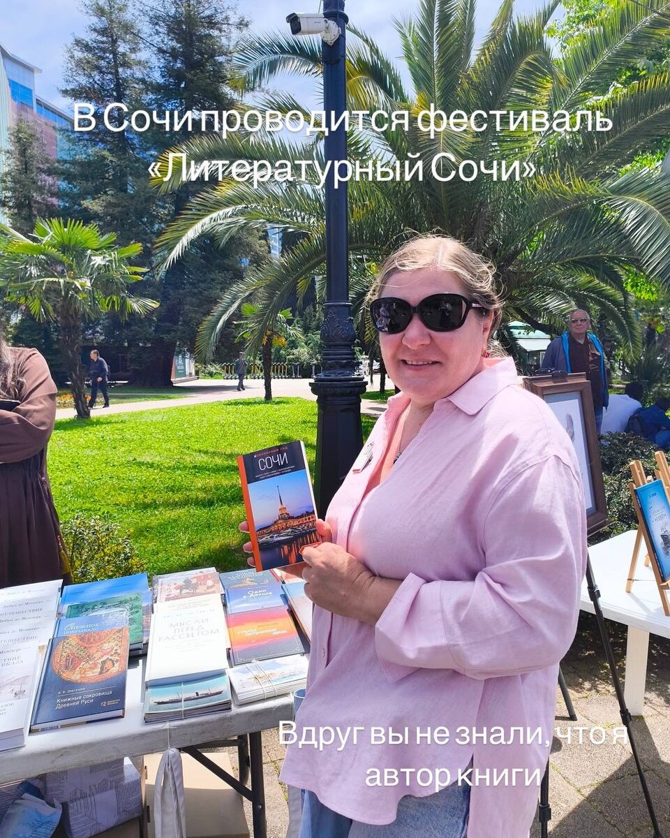 Так вот, я написала книгу и сегодня меня пригласили поучаствовать в фестивпле «Литературный Сочи» и даже предложили отдельный стенд. Но реализацией моей книги занимается издательство ЭКСМО. Авторские экземпляры давно разлетелись, а книгу можно купить на маркетплейсах и в сетевых книжных магазинах.