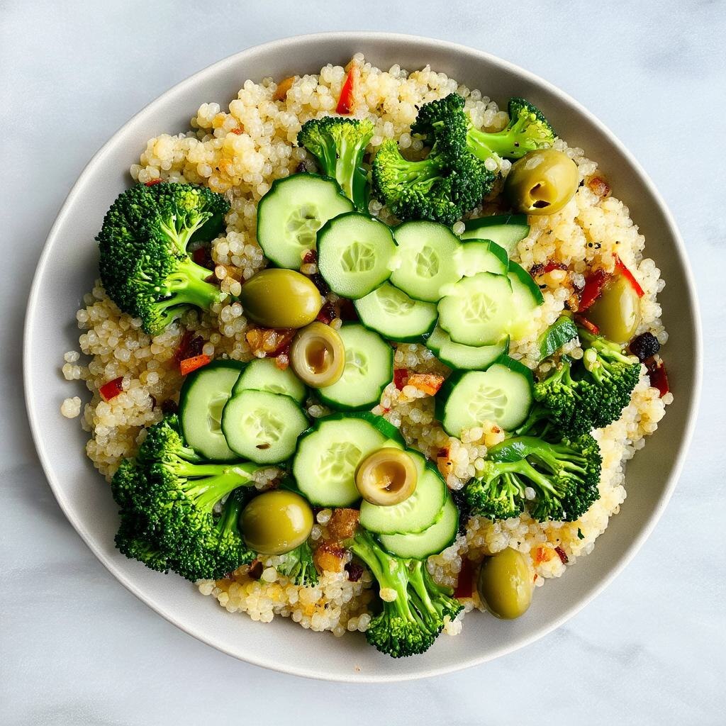 В глубокую тарелку выкладываю киноа - как базу. Сверху выкладываю гриль-брокколи, нарезанный огурец, оливки. Поливаю соусом. Украшаю остатками орехов, листочком зелени. Всё - жизнь в балансе на одной тарелке.