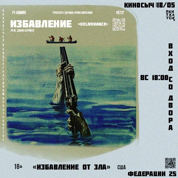 «Deliverance» | «Избавление» | 1972г Режиссёр: Джон Бурман Страна: США Жанр: триллер\приключения Продолжительность: 1 ч 49 м 🗓️ 18 мая 18:00 📍Федерации 25, вход через двор в ПЕНТХАУС Описание: Долина реки Кахулавасси — одно из последних нетронутых человеком природных мест, который вскоре изменится из-за строительства плотины на реке, что, в свою очередь, приведёт к затоплению большей части окрестностей. Четверо друзей, представителей среднего класса, решают отправиться в многодневное путешествие на каноэ по реке чтобы успеть прикоснуться к уничтожаемой дикой природе. Только у двоих есть опыт жизни на природе. Они знают, что местность изолирована. Их относительно спокойное путешествие на полпути превращается в кошмар из-за речных порогов и недоброжелательности местных реднеков. 🏷️ вход свободный #18мая25