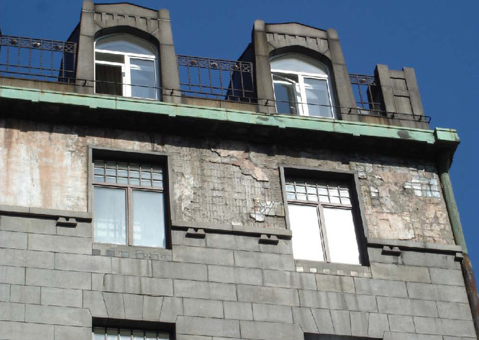 Жило-было керамическое панно Рериха на фасаде дома Страхового общества Россия., но на нем не хватало несколько изразцов. Точнее сказать, несколько изразцов на нем сохранилось, а остальные унесло течением времени: