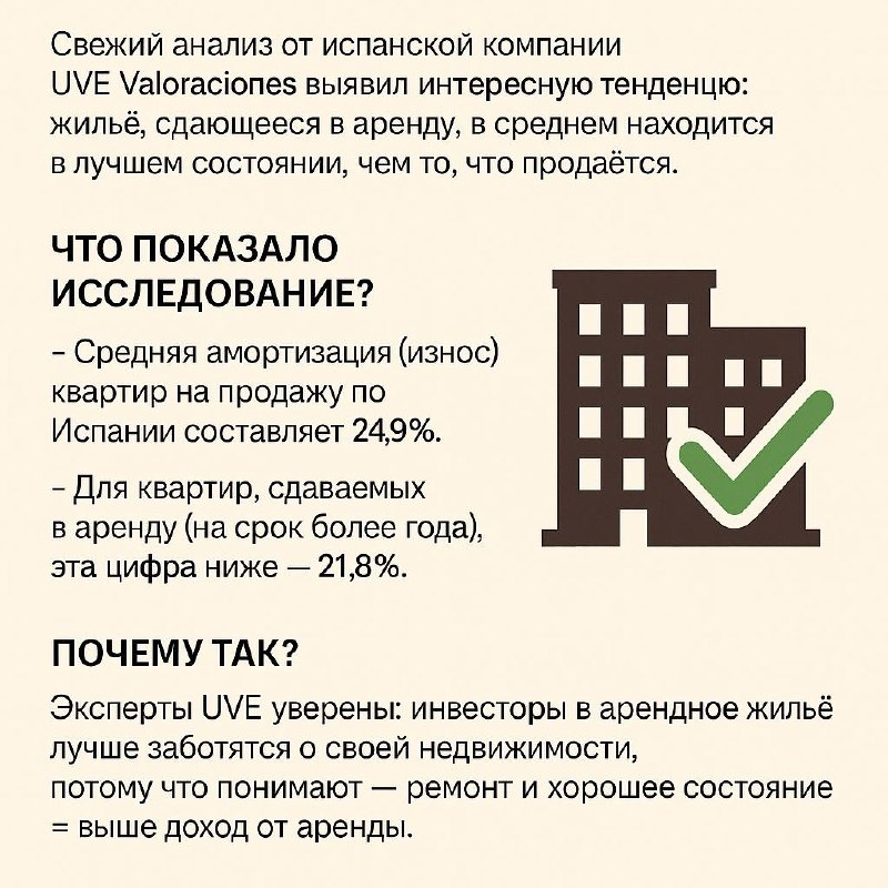 🏘 Почему квартиры для аренды часто в лучшем состоянии, чем те, что выставлены на продажу? Свежий анализ от испанской компании UVE Valoraciones выявил интересную тенденцию: жильё, сдающееся в аренду, в среднем находится в лучшем состоянии, чем то, что продаётся. 🔍 Что показало исследование? Средняя амортизация (износ) квартир на продажу по Испании составляет 24,9%. Для квартир, сдаваемых в аренду (на срок более года), эта цифра ниже — 21,8%. То есть жильё в аренду изнашивается на 3 п.п. меньше, чем то, что выставлено на продажу. 📈 Почему так? Эксперты UVE уверены: инвесторы в арендное жильё лучше заботятся о своей недвижимости, потому что понимают — ремонт и хорошее состояние = выше доход от аренды. В отличие от владельцев, которые продают, арендодатели заинтересованы в том, чтобы жильё оставалось в хорошем виде долгие годы. 📍 А как в разных городах? Разница в износе особенно заметна в: Мадриде Барселоне Сантандере Сарагосе Пальме-де-Майорке Лас-Пальмас Валенсии Здесь аренда —