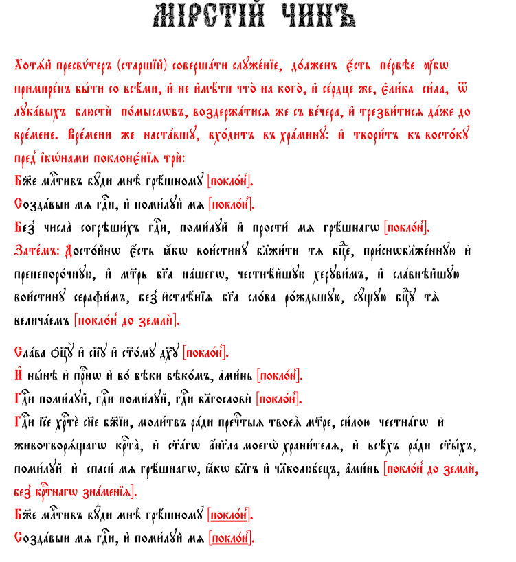 По указаниям Богослужебного Устава, за неимением священника, церковные богослужения могут совершать миряне так называемым «мирским чином» по богослужебным книгам, в порядке вычитывания и выпевания положенных Уставом псалмов, стихир, тропарей и канонов.