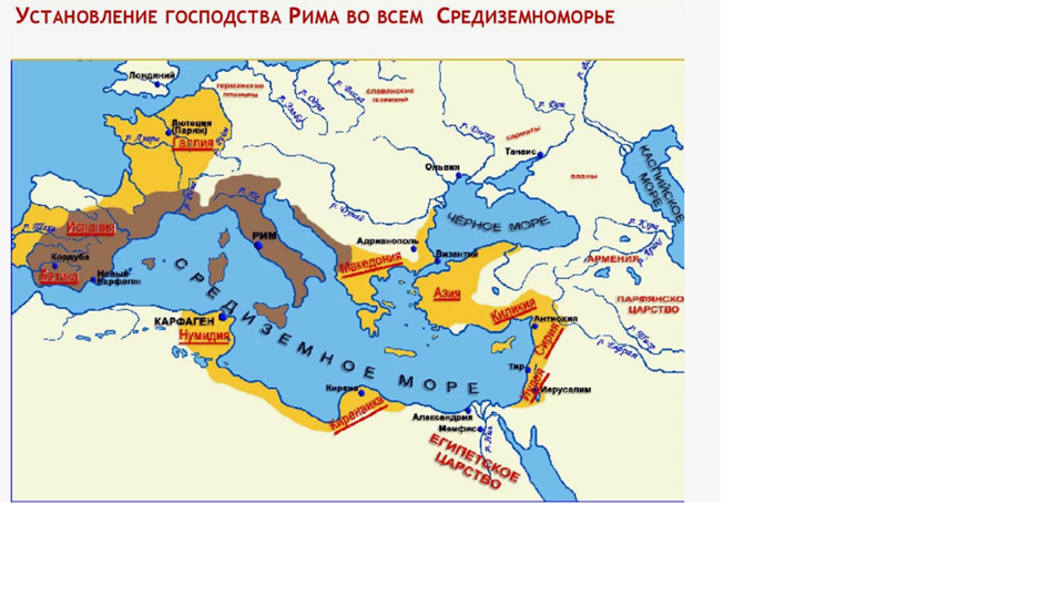 Следующей целью римской экспансии стал захват господства над всем Средиземноморьем, где Риму противостоял достойный противник – Карфаген. В ходе трёх Пунических войн Рим уничтожил Карфагенское. Это позволило Риму продолжить экспансию в другие районы Средиземноморья. И к I веку до н. э. Рим добился своего, превратившись в гегемона, став единственным хозяином Средиземноморья. После гибели единственного конкурента Карфагена на Средиземноморье не было никого, кто способен был оказать сопротивление могущественному Риму. Поэтому началось стремительное расширение римского государства на север. Благодаря завоеваниям Юлия Цезаря в 50-х годах до н.э. к Риму была присоединена Галлия.