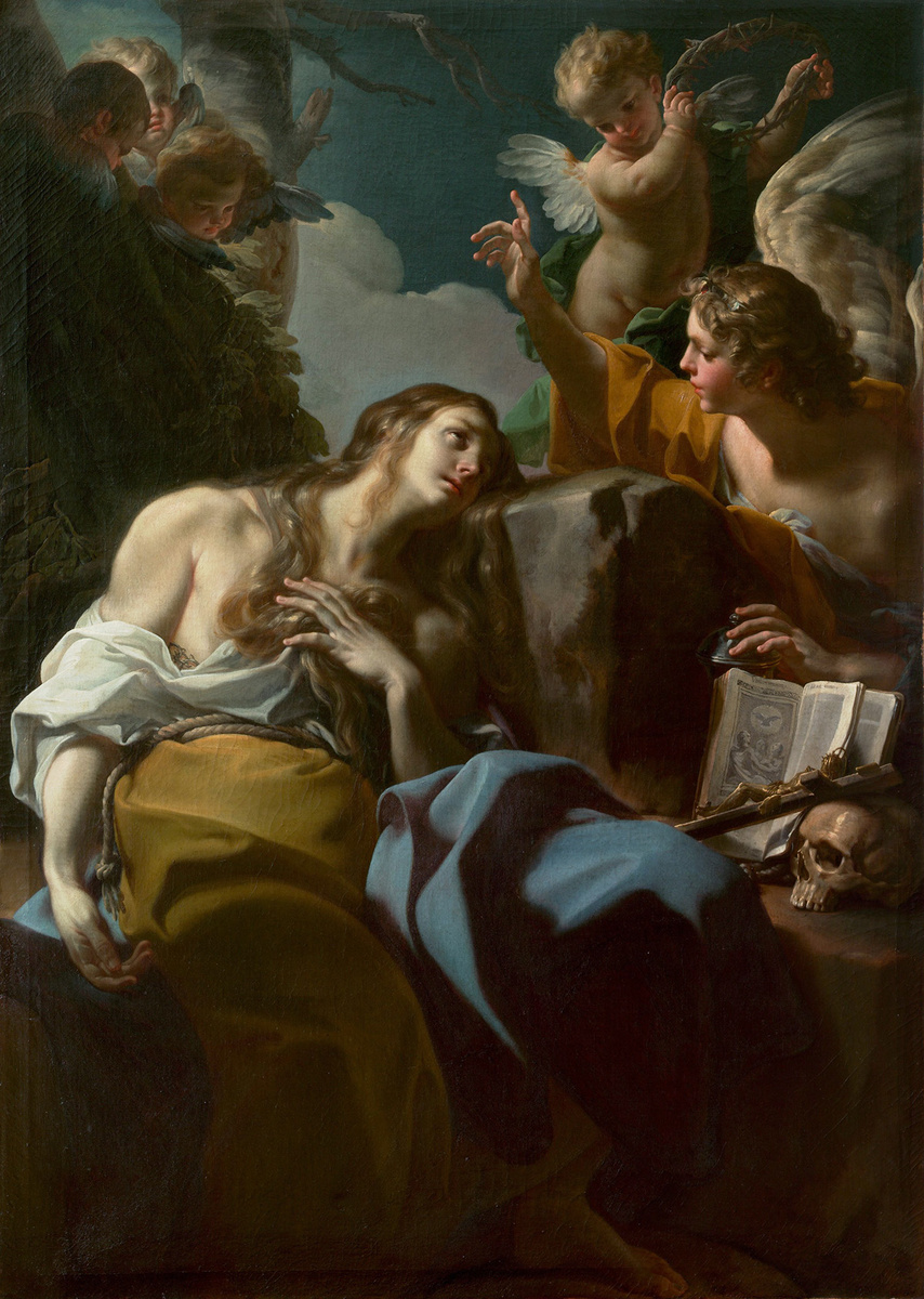 Согласно легенде, Мария Магдалина закончила свою жизнь в пещере близ Марселя, где её ежедневно посещали ангелы. Их песни были её единственной пищей. На этой исключительно красивой и трогательной картине Коррадо Джаквинто (1703-1766) изображает Марию в покаянном одеянии, её голова томно покоится на камне, а взгляд сосредоточен на жестикулирующем ангеле и терновом венце, демонстрируемом херувимом. Джаквинто был мастером деталей натюрморта; здесь он изобразил молитвенную книгу, распятие, череп и сосуд с благовониями, которыми Мария Магдалина, как говорят, умастила ноги Христа. Сочетание чувственности и мистического пыла, кажется, является осознанной отсылкой к творчеству Джан Лоренцо Бернини (1598-1680). Написанный в Риме около 1750 года и до сих пор находящийся в своей оригинальной раме, этот шедевр религиозной живописи служит контрапунктом репутации Джаквинто как выдающегося художника декоративной фрески после Джованни Баттиста Тьеполо (1696-1770). После работы в Турине, Чезене, Риме