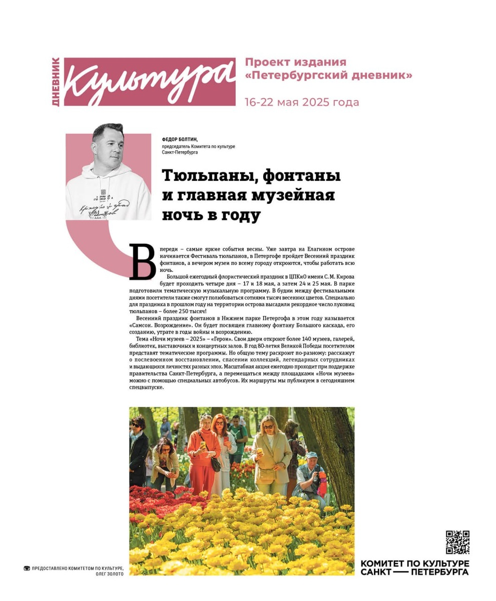 📰 А вы уже прочитали Культурную вкладку «Петербургского дневника»? Председатель Комитета по культуре Санкт-Петербурга Федор Болтин — о главных весенних событиях: фестивале тюльпанов на Елагином острове, празднике фонтанов в Петергофе и масштабной акции «Ночь музеев». Подробнее читайте в пятничном выпуске нашей газеты. Петербургский дневник