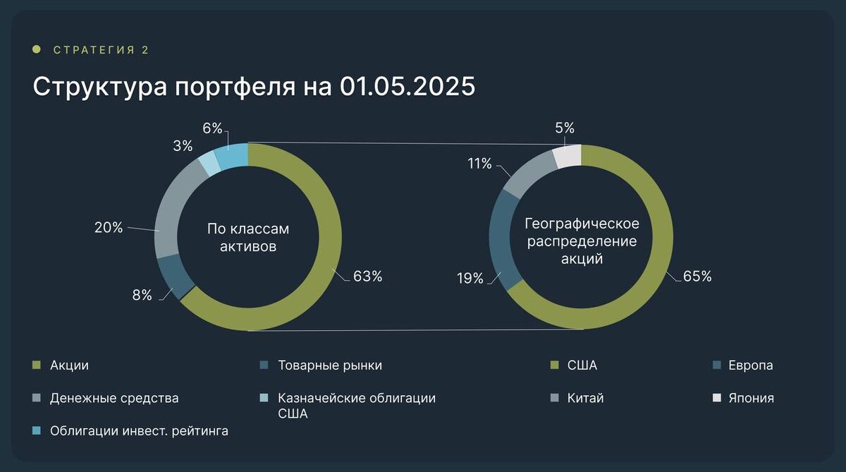 🚀 Завершаем обзоры стратегий за апрель. На очереди — умеренно агрессивная Эта стратегия предполагает, что состав портфеля регулярно пересматривается, меняется распределение по классам активов и реализуются тактические идеи с отбором конкретных инструментов для покупки и продажи. Стратегия предусматривает экспозицию на глобальный рынок с максимальной долей акций и ETF на акции до 80%, а также диверсификацию по странам. Валюта: доллар США. ☑️ Результаты стратегии: в апреле портфель вырос на 0,9%, несмотря на падение американского рынка: ETF RSP просел на 2,4%, ETF IWM — на 2,3%. ETF VGK, ориентированный на европейский рынок, показал положительную динамику (+3,8%) благодаря ослаблению доллара. Китайский рынок также оказался в отрицательной зоне (ETF CQQQ — минус 5,3%). ETF IAU на золото завершил месяц уверенным ростом (+5,4%) на фоне усиления геополитической напряженности. Это еще раз подчеркивает важность диверсификации портфеля. Таким образом, несмотря на умеренно негативную динамик