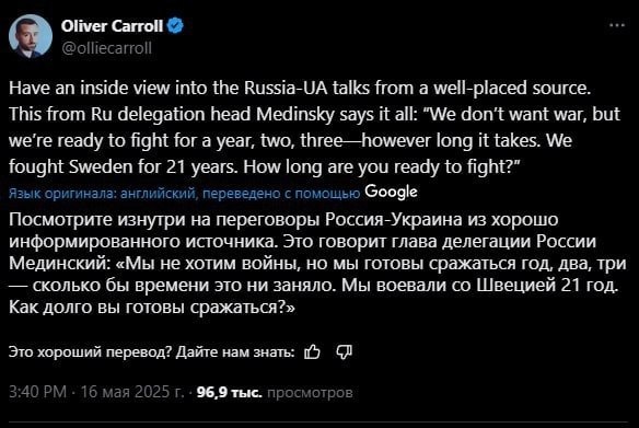 Мы не хотим войны, но готовы воевать год, два, три — столько, сколько потребуется. Мы воевали со Швецией 21 год. А вы сколько готовы воевать? — такой вопрос задал Мединский на переговорах с Украиной, сообщает The Economist Шарья – столица мира Крупнейшее городское СМИ Источник