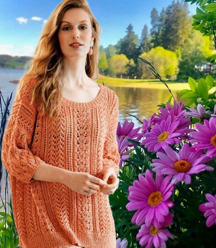 Здравствуйте, уважаемые подписчики и гости канала "ЖЕНСКАЯ ТЕРРИТОРИЯ" Сегодня на канале тема: "ВЯЗАНИЕ" И рассмотрим мы с вами красивую модель джемпера свободного силуэта нежно — оранжевого оттенка. Модель связана спицами с миксом узоров. Джемпер сочетает в себе сразу четыре ажурных узора: три из них расположились по спинке и переду, а четвертым узором выполнены рукава. Эта модель вяжется прямыми отдельными деталями переда и спинки. Спущенные рукава сужены к манжету. Данная модель джемпера прекрасно подойдет для прохладных летних дней. Благодаря натуральному составу пряжи модель смотрится элегантно и благородно. Для вязания данной модели нам потребуется пряжа с натуральным составом: 80% хлопка, 20% шерсти; 140 м/50 г. Связать джемпер можно на размеры: 36/38 (42) 46/48 Расход пряжи зависит от размеров: 400 (450) 500 г. — оранжевого цвета. Вязать спицы № 4 Ряды в прямом и обратном направлении (нечетное число петель). Лицевые ряды: кромочная, попеременно 1 лицевая, 1 изнаночная, зак