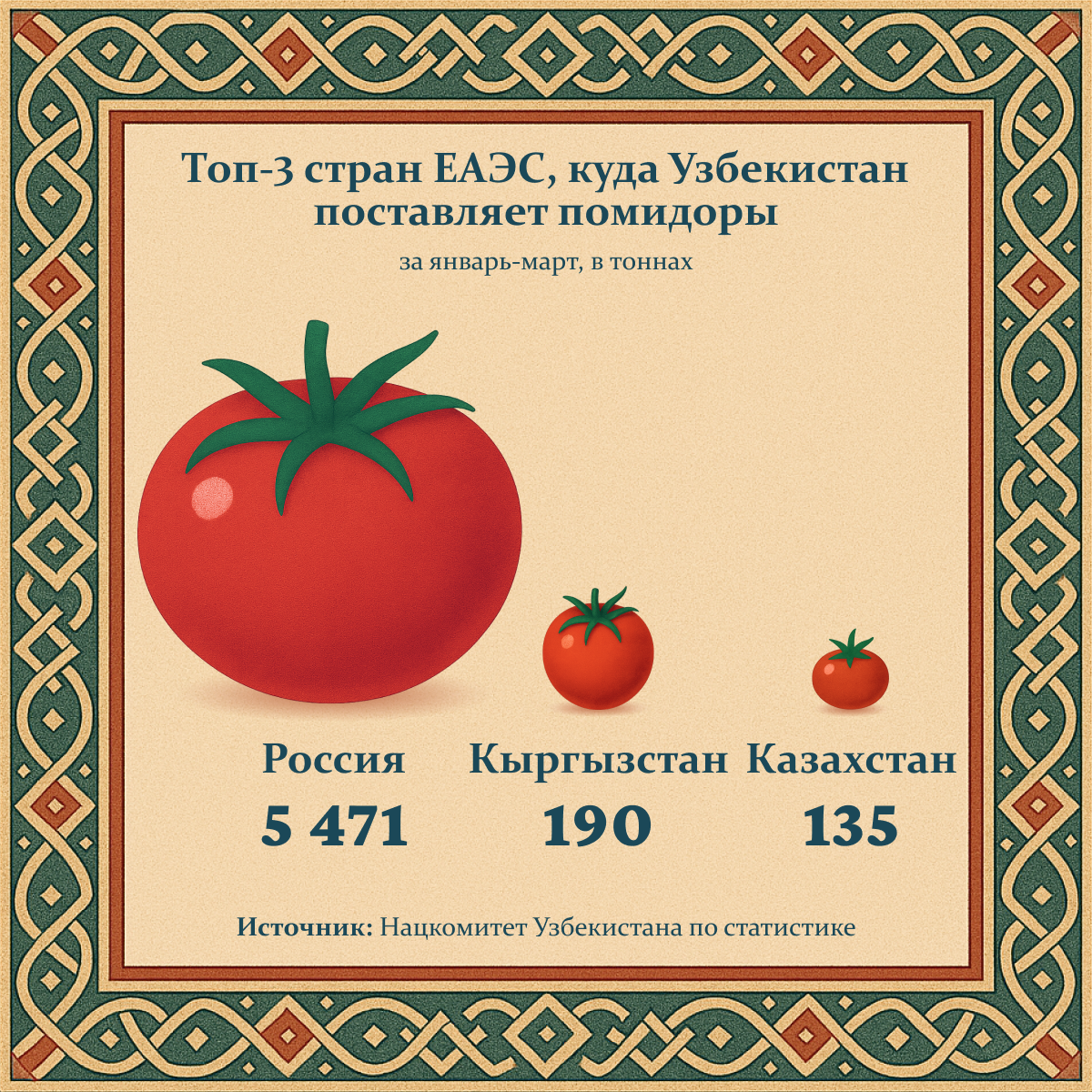 Как сообщает Национальный комитет по статистике, республика за 3 месяца 2025 года продала 5 869 тонн помидоров за 6,8 млн долларов. Большая часть экспорта пришлась на страны ЕАЭС.