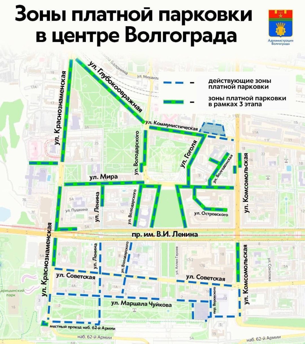 Зона платных парковок в центре Волгограда расширится новыми 14-ю участками. В полном объеме они начнут работать с понедельника, 19 мая. Информацию обнародовала администрация города. Платное парковочное пространство вводится на ряде участков Первой Продольной, а также улиц Мира, 10-й Дивизии НКВД, Коммунистической, Ленина, Глубокоовражной, Краснознаменской, Набережной 62-й Армии (у здания №1а), Володарского, Гоголя, Островского, Волгодонской, Комсомольской и Аллее Героев. Схема от администрации Волгограда Стоимость часа стоянки составит 40 рублей за легковую автомашину. Не оплачивать можно лишь в том случае, если машина простояла пробыла на парковке лишь 15 минут. В случае, если автомобиль продолжает оставаться на парковочном пространстве, то эти 15 минут входят во время парковочной сессии. Бесплатно запарковаться здесь возможно с 20:00 вечера до 8:00 утра, а также в выходные и праздничные дни. О том, как оплатить парковку, мы рассказывали на примере Привокзальной площади. Тех, кто не