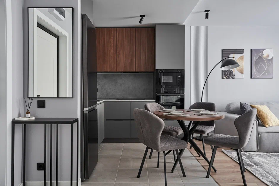 На границе между кухней и гостиной поставили круглый обеденный стол. Его заказали у того же производителя, который изготавливал гарнитур. Столешница выполнена в одном цвете с верхними фасадами. Стол и стулья «смягчают» лаконичные и прямоугольные формы мебели.