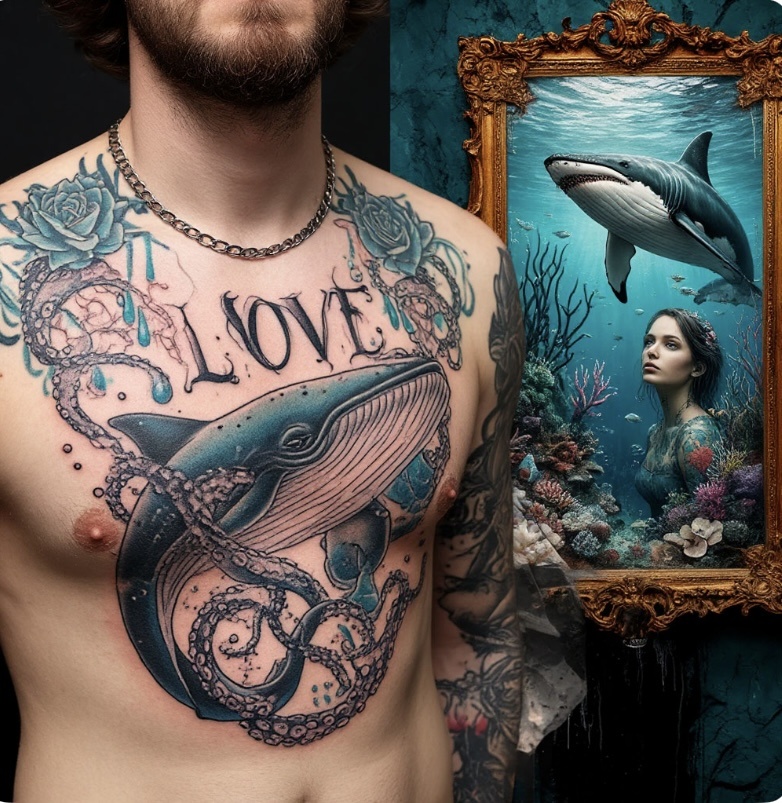 Я — каракатица, чьи чернила стали тату. Спросите, о чем я молчу Меня звали Ирида — имя, которое дали мне волны, шептавшие его на рассвете, когда я пряталась в щели между двух скал. Мои щупальца переливались, как масло на воде, а чернила пахли лавандой и медью. Я не была хищницей. Я была художницей: рисовала облаками тьмы портреты акул, чтобы те, ослепнув, проплывали мимо. Танец, который не увидели люди В Эгейском море я дружила с осьминогом Алкивиадом. Он смеялся над моей любовью к узорам: — «Зачем тратить чернила на искусство? Выплюнь их в лицо врагу и сбеги!» Но я верила, что красота — лучшая защита. Когда кораллы умирали от жары, я окутывала их чёрными вуалями, чтобы скрыть позор белизны. Когда рыба-меч теряла путь, я рисовала ей стрелы из икринок. Однажды я нарисовала корабль — точную копию триремы, затонувшей здесь две тысячи лет назад. На следующий день в него врезался катер туристов. Люди кричали, что видели «призрак античности». Алкивиад сказал: — «Ты играешь с огнём, к