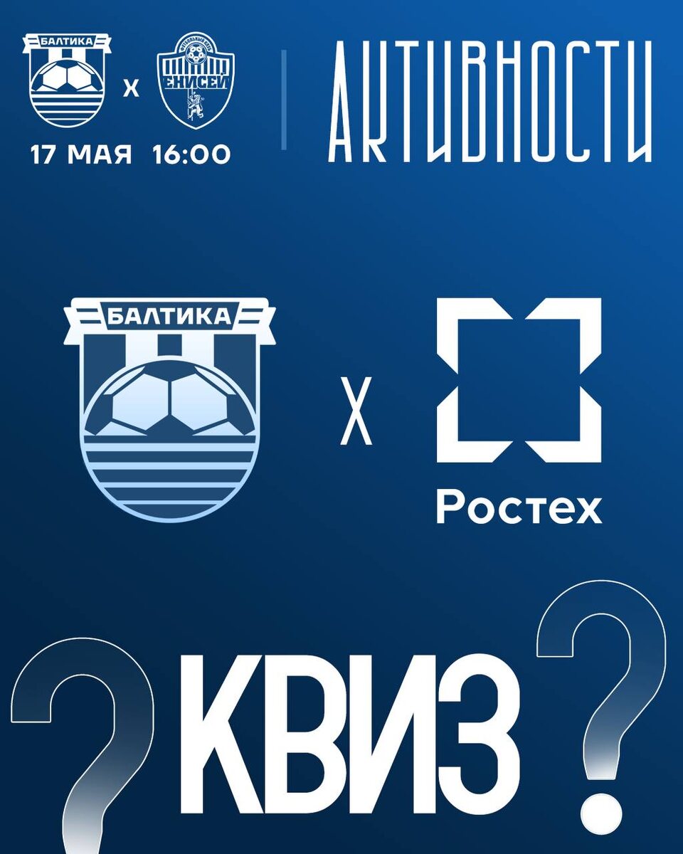 КВИЗ ДЛЯ БАЛТИЙЦЕВ 🧠 Совместно с нашим генеральным партнёром «Ростех» мы подготовили для вас настоящий интеллектуальный баттл! Что вас ждёт: Оффлайн-квиз у первого гейта! Наши партнёры проведут увлекательную викторину — обязательно зарегистрируйся заранее по ссылке у наших друзей, «Держи Пять!», кто поможет нам с проведением квиза: https://clck.ru/3M75tP ❗️ Необходимо собрать команду из 4 человек и при регистрации указать ее название, а также в каком из 2 квизов будете принимать участие. Если вы идете на стадион один – не беда, подходите заранее и записывайтесь. Мы обязательно вам подберем команду. ⏰ Когда? • с 14:20 до 14:50 - квиз №1 • с 15:00 до 15:30 - квиз №2 А также квиз в чаше стадиона перед началом матча! Интеллектуальное сражение для всех болельщиков прямо на трибунах! Следи за экранами, переходи по QR-коду и подключайся к квизу онлайн! ⏰ 15:45 Победителей ждут классные призы от «Ростех» и ФК «Балтика»! А самое главное — вручение призов состоится в перерыве матча