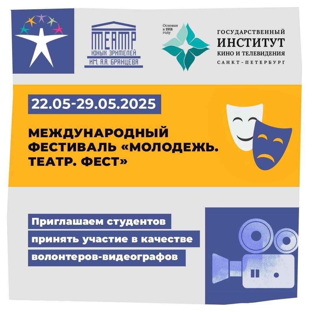 💥Приглашаем принять участие в XXVI Международном театральном фестивале «МОЛОДЕЖЬ. ТЕАТР. ФЕСТ» Один из самых престижных театральных фестивалей России возвращается! С 22 по 29 мая ТЮЗ им. А. А. Брянцева проведёт XXVI Международный театральный фестиваль «МОЛОДЕЖЬ. ТЕАТР. ФЕСТ» (в прошлом «Радуга») В этом году зрителей ждут 20 спектаклей за 8 дней, включая лучшие постановки из Турции, Туниса, Беларуси, Бразилии, Абхазии, Армении, Казахстана, Узбекистана и Венгрии. Россию представят театры из Москвы, Санкт-Петербурга, Новосибирска, Донецка, Барнаула, Астрахани, Нижневартовска и Иваново. 💥Приглашаем студентов ГИКИТ принять участие в фестивале в качестве волонтеров-видеографов! 📌С 22 по 29 мая 2025 года Для получения информации и записи обращайтесь к Варваре +7 921 887-13-79