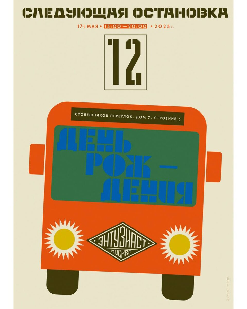 ЭНТУЗИАСТ 12 — МУЗЫКА🚦 17 мая, суббота Осторожно, двери закрываются. Следующая остановка — день рождения Энтузиаста! 17 мая 2013 года с открытия дверей Энтузиаста началась история нашего любимого Двора! Приглашаем всех друзей на праздничный маршрут, посвященный двенадцатому дню рождения мотокафе. По пути следования вас ждут праздничные диджей-сеты, искрящийся уличный бар от ТОТО, гриль-спешелы на углях, большая партия новых значков «Энтузиаст», дружеские посиделки у огня и много других приятных сюрпризов от резидентов Двора! Сохраняйте расписание музыкального маршрута: 15:00 — 16:40 Chagin 16:40 — 18:20 Kotzi Brown 18:20 — 20:00 Vlad Mikeev афиша — Дима Пантюшин 🎫 Вход свободный 📆 17 Мая, с 15:00 📍Энтузиаст, Москва, Столешников переулок, 7с5