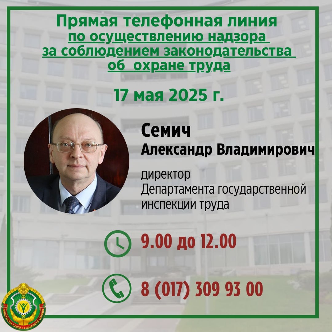☎️ Прямая телефонная линия по вопросу осуществления надзора за соблюдением законодательства об охране труда Завтра, 17 мая, директор Департамента Семич Александр Владимирович проведет прямую телефонную линию 🕘 9.00 до 12.00 📞(8 017) 309 93 00