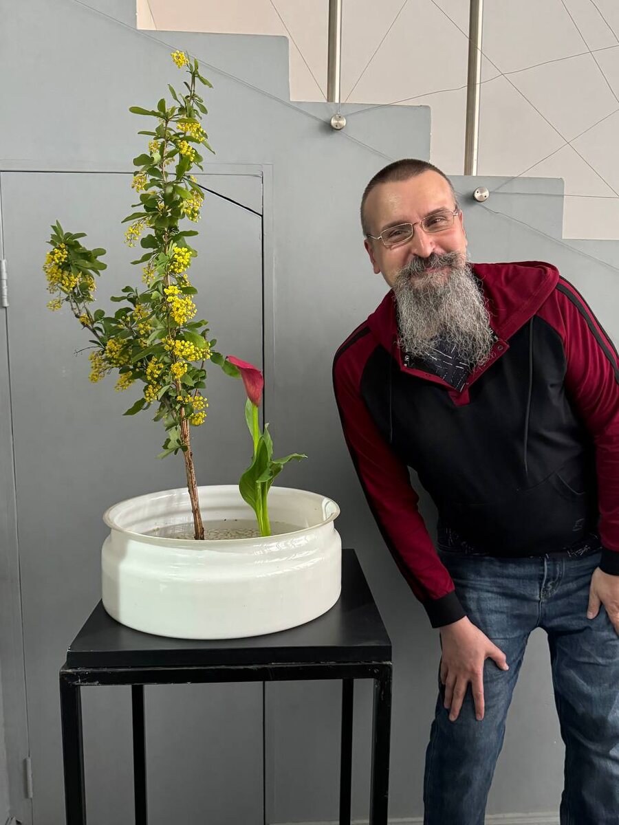 В торжественной демострации икэбана на открытии выставки школы Икэнобо выступил Мамонов Алексей Борисович - автор каллиграфии и оформления афиши выставки 2025.
