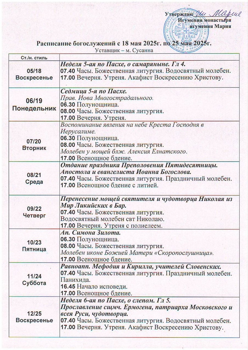 18-25.05. Расписание богослужений в Введенском женском монастыре г. Иваново