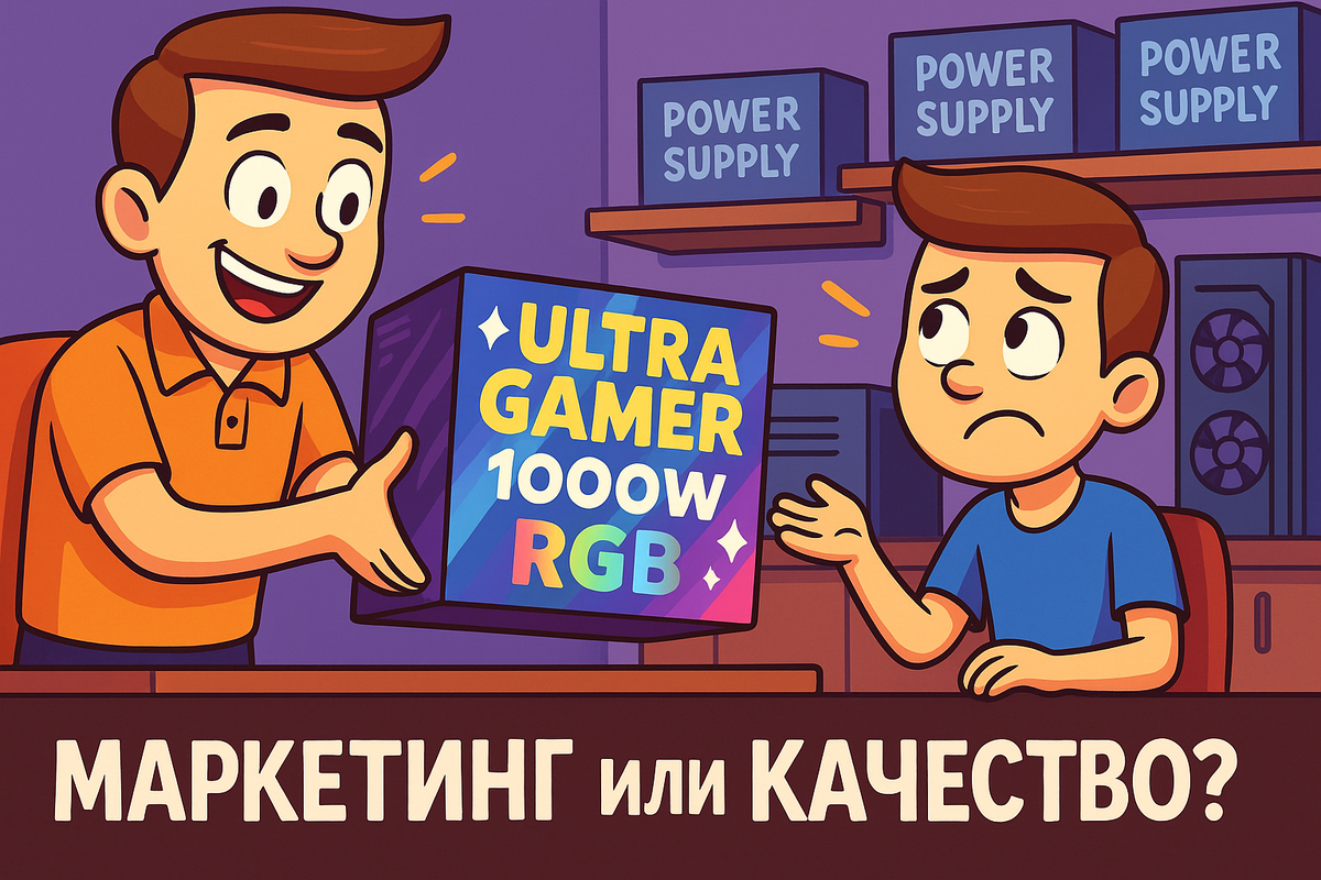 Именно в этот момент я понял: пора разбираться, как работает маркетинг в железе и как он тебя обманывает. Вот фразочки, которыми завлекают в любом магазине: На деле — всё это часто маркетинговая приправка к обычной, не всегда качественной начинке. Тот самый “ультра-геймерский” блок был громоздким, тяжёлым, блестящим. На нём было: 💥 Он был красивым. И абсолютно бесполезным. Многие думают: чем больше Вт — тем круче.