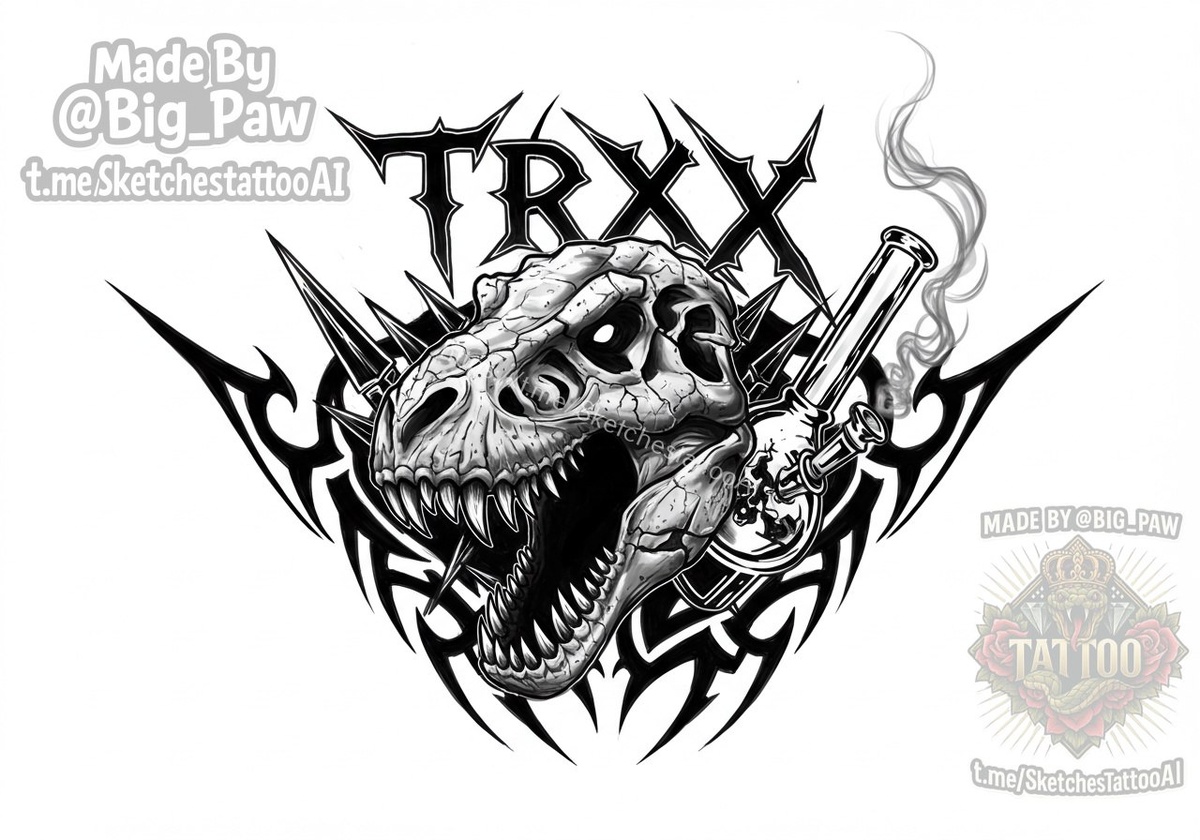 #2414 Подборка по запросу подписчика - Можно слово TRXX в стиле шрифта неотрайбл или такой как тут, на 3 пикче. чтоб на спину можно было . Под надписью череп динозавра тирекса тоже с некими частицами трайбла. Ещё можно куда-то бонг приделать? 🧠 SYNTX 💳 Донат 😎 НейроБро 😎 Эскизы без вотера 💀 Эскизы от нейросети #надпись #динозавр #трайбл #эскизы #тату #татуировки