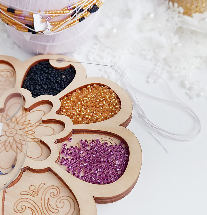Начинала свой творческий путь с вышивки картин крестиком. Все, что мне требовалось для этого - пяльца, канва, схема, иголка и моточки ниток нужных оттенков. Меня не заботил антураж - красивые бобины, подставки для схемы. И удобства не волновали - вышивала в любом уголке квартиры. Лежа, сидя на диване, на полу, в кровати или за кухонным столом. Когда же "заболела" вышивкой украшений, то материалов стало не в разы, а на порядок больше! И для спокойного вышивального процесса хотелось все необходимое аккуратно разместить на столе, чтобы не падало, не закатывалось и не смешивалось. Тогда и начала постепенно заводить помощников. В первую очередь - это палитра. Очень удобно размещать бисер в ячейках по цветам. Прозрачная пластиковая крышечка на магните надежно закрывается и защищает от просыпания. Во-вторую (давняя мечта) вышивальный станок. Для съемки мастер-классов очень нужная и удобная вещь! Перед камерой не мельтешит вышивка, все зафиксировано. Только руки колдуют над полотном. Ну и,