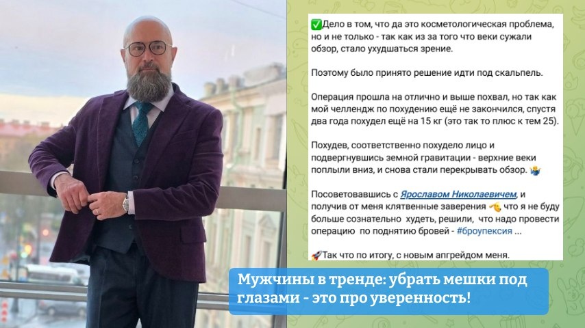 Да, мужчины тоже делают блефаропластику. И делают не ради красоты. А чтобы взгляд был открытым, уверенным, сильным. Без мешков, усталости и тяжелых век. Наш пациент - мужчина - пришел к нам за тем же. Результат - минус десяток лет и ни намека на "пластику". Блефаропластика - для тех, кто привык брать от жизни максимум! 📌Здесь можно подробнее ознакомиться с его дневником наблюдений после операции: https://t.me/BRUTALoverFIFTY/219