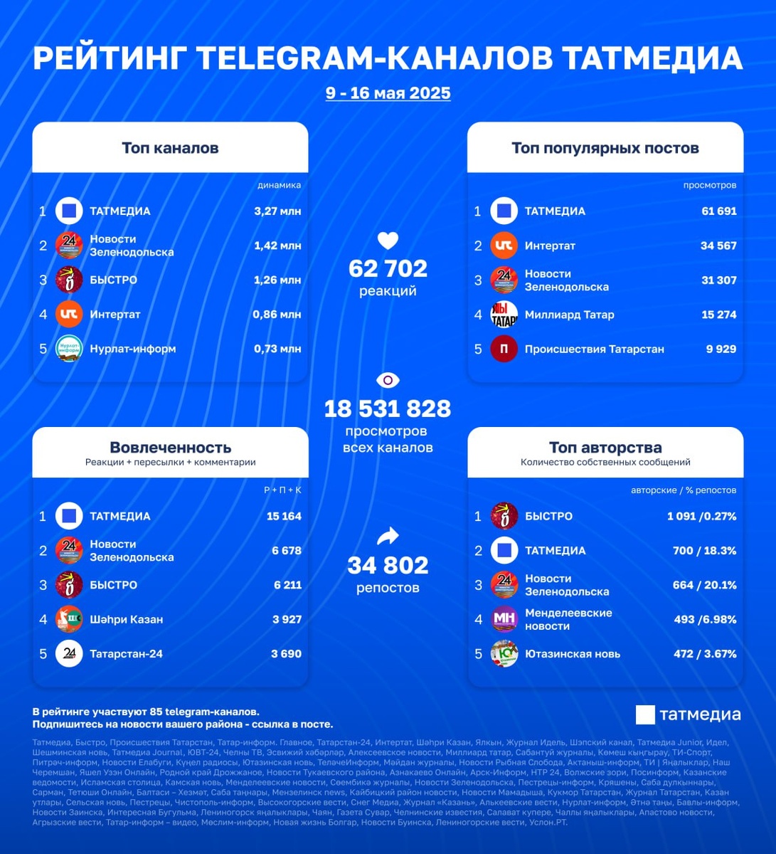 В ответ на пост 📊📱Рейтинг каналов Татмедиа | 9 - 16 мая Каналы с наибольшим числом просмотров: 1. ТАТМЕДИА - 3 279 134 2. Новости Зеленодольска - 1 426 883 3. БЫСТРО - 1 267 819 4. Интертат - 863 578 5. Нурлат-информ - 731 889 Посты с наибольшим числом просмотров: 61 691 🔹 ТАТМЕДИА: На здании Татмедиа в Казани появилось число 80 в честь юбилея Великой Победы С праздником, дуслар! 34 567 🔹 Интертат: Күптән түгел Казанда Фатих Кәримгә һәйкәл ачылды. 31 307 🔹 Новости Зеленодольска: Зачем нужен принц на белом коне, когда есть полицейский на гнедом? 15 274 🔹 Миллиард Татар: Историк Тэймур Галимов борется с раком и ему нужна наша помощь. 9 929 🔹 Происшествия Татарстан: Супругов из Зеленодольска задержали за легализацию 1,5 тыс. мигрантов. 8 860 🔹 БЫСТРО: Президент России Владимир Путин предложил Киеву возобновить прямые переговоры без предварительных условий. 6 686 🔹 Татар-информ. Главное: В новом выпуске программы «Кофе с батюшкой» иерей Александр Ермолин рассказал о всех