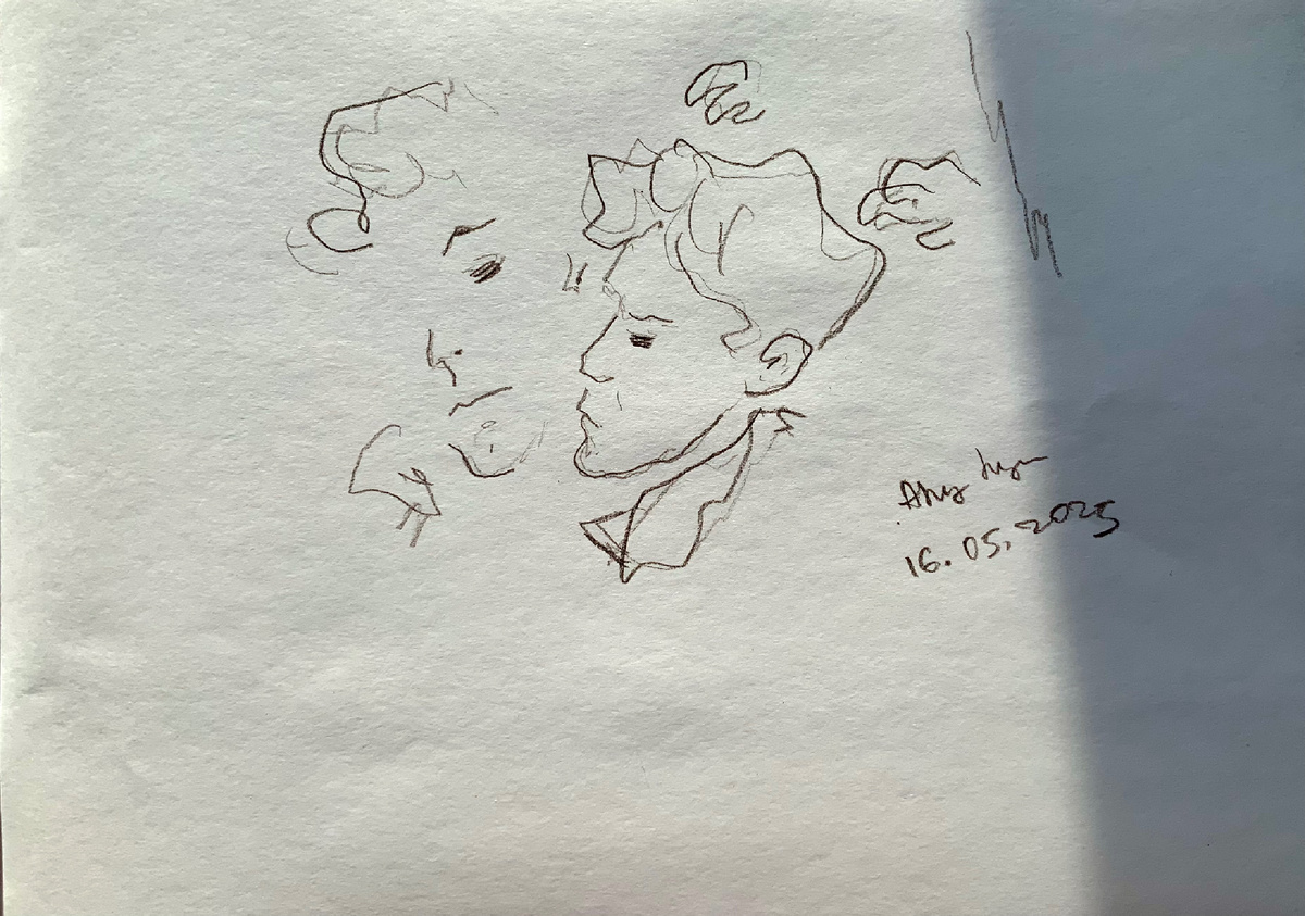 Вот я и добралась до «Орфея» Жана Кокто :) Смотреть этот фильм я опасалась из-за тематики. Все же история Орфея и Эвридики грустная. Но интересно наблюдать за тем, как Кокто переводит эту античную историю в современность. И использует для этого современные на тот момент технологии: автомобили, мотоциклы, радио. И средства управления обществом: газеты, общественные организации, группы фанатов, суды, префектуры. Все врут: кто во благо, а кто и во вред. Орфей и сам хорош, честно сказать: он несколько заносчив и холоден. Но кто из нас идеален? И он говорит: «Камни, камни! Толпа как всегда бросает камни!» Не так уж много изменилось с тех пор! Так выходит. * И фильм местами действительно жутковат. Но я не могу сказать, что он страшный или слишком пугающий. К тому же, иногда стоит столкнуться со своими страхами, чтобы стать храбрее. *** Для того чтобы нарисовать скетч, я выбрала знаменитую сцену у зеркала. Мы можем здесь видеть, как меняется антураж в зазеркалье, куда уходит Орфей, перед тем,