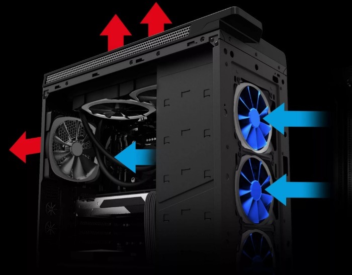 - Выдув-вдув. Впереди и снизу — вдув (прохладный воздух внутрь). Сзади и сверху — выдув. Поток идёт сквозняком, и вентиляторы не дерутся между собой.
