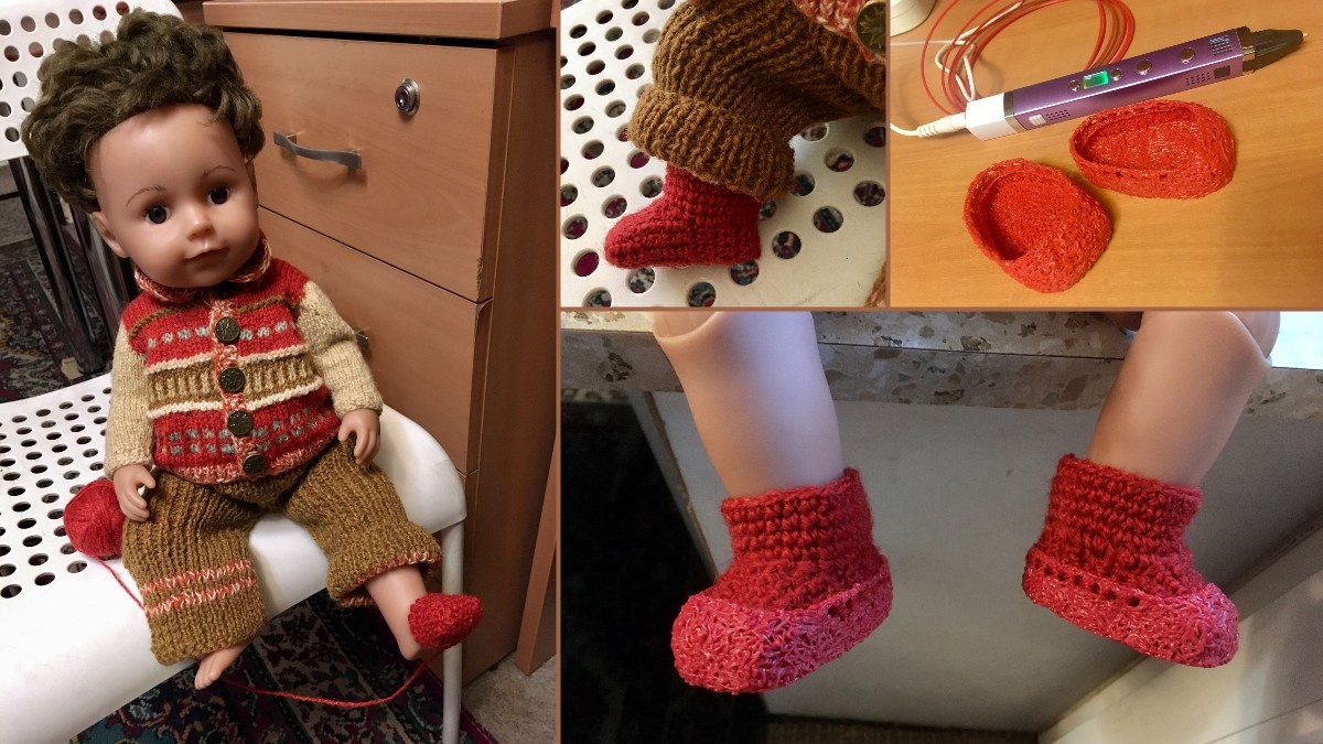 Подробный мастер-класс в фотографиях: как сделать сапожки с вязаным верхом и пластиковым низом, нарисованным 3d-ручкой, для куклы-мальчика ростом 48 сантиметров.