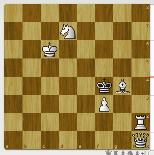 Автор задачи Лебедев Л.А., 1995 год. Черный король лихо маневрирует между белыми фигурами. Однако белые начинают и ставят мат в 2 хода. Более мощная задача тут >>>> Первый верный ход смотрите в галерее.