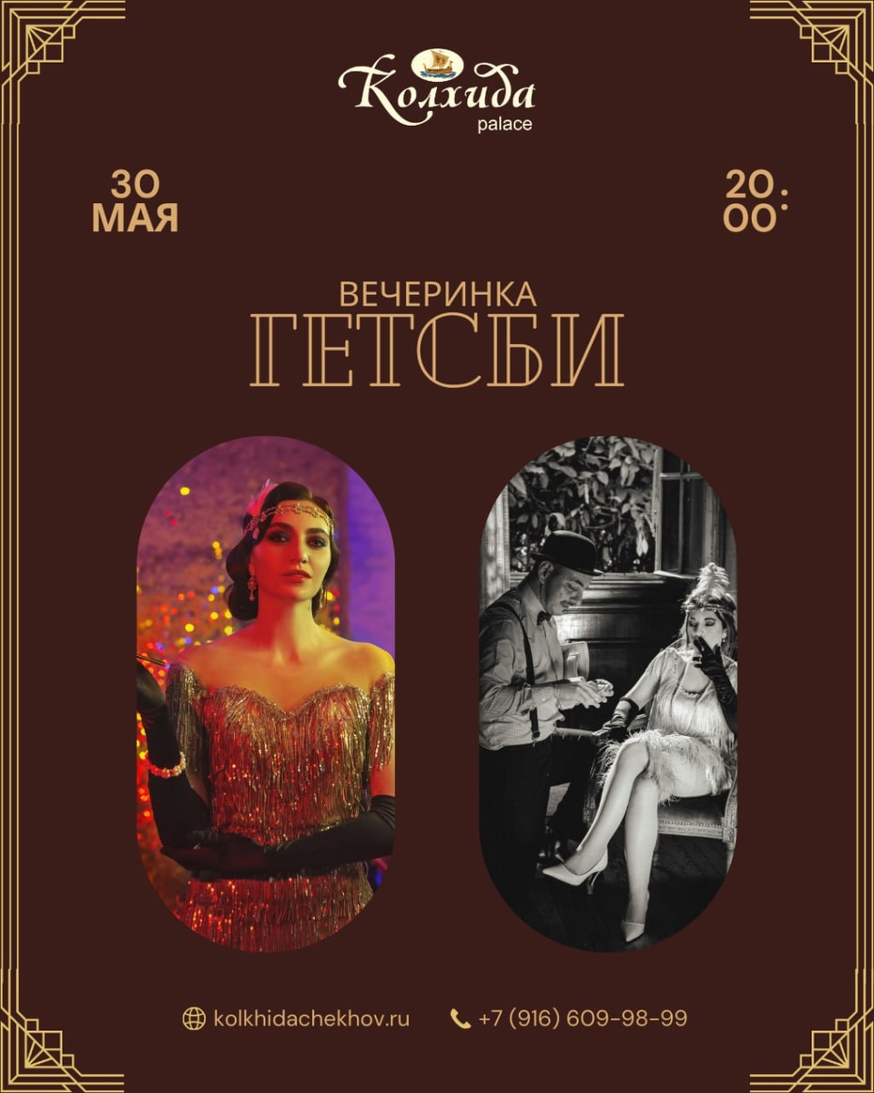 🌟 GRAND GATSBY PARTY 🌟 📍 Колхида Palace 30 мая | 20:00 💥 Погрузитесь в эпоху джаза, роскоши и блеска! Вас ждёт по-настоящему незабываемый вечер: ▫️ ЖИВОЙ ВОКАЛ и чарующая музыка ▫️ ЯРКИЕ СЮРПРИЗЫ и интригующие конкурсы ▫️ Атмосфера безумных 20-х и дух Великого Гэтсби ▫️ Танцы, блеск и стиль! 🎩 ДРЕСС-КОД ОБЯЗАТЕЛЕН Пайетки, перья, боа, шёлк, фраки — блистайте на полную! Вечер, где всё возможно. Только для избранных. Не упусти шанс попасть в легенду 💫 💸Стоимость билета 1000₽ 📞 Бронь столов и информация по телефону: +7 (916) 609-98-99