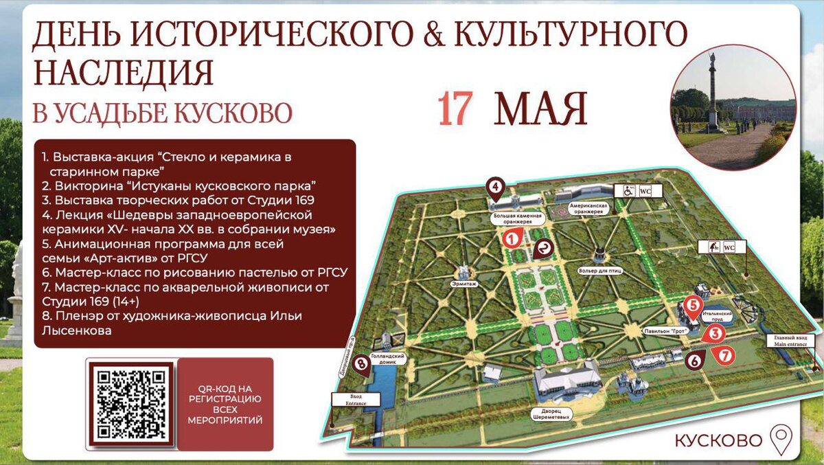 День исторического и культурного наследия в усадьбе Кусково ⏰ 17 мая с 10.00 до 18.00 приглашаем вас на нашу насыщенную программу мероприятий. Вас ждут: 📌выставка работ учащихся «Студия 169»; 📌выставка-акция «Стекло и керамика в старинном парке»; 📌мастер-класс по рисованию пастелью; 📌пленэр с художником-живописцем; 📌мастер-класс по акварельной живописи; 📌лекция «Шедевры западноевропейской керамики XV- начала XX вв. в собрании музея»; 📌викторина по регулярному парку «Истуканы Кусковского парка». Ознакомиться с полной программой и зарегистрироваться на мероприятия можно по ссылке