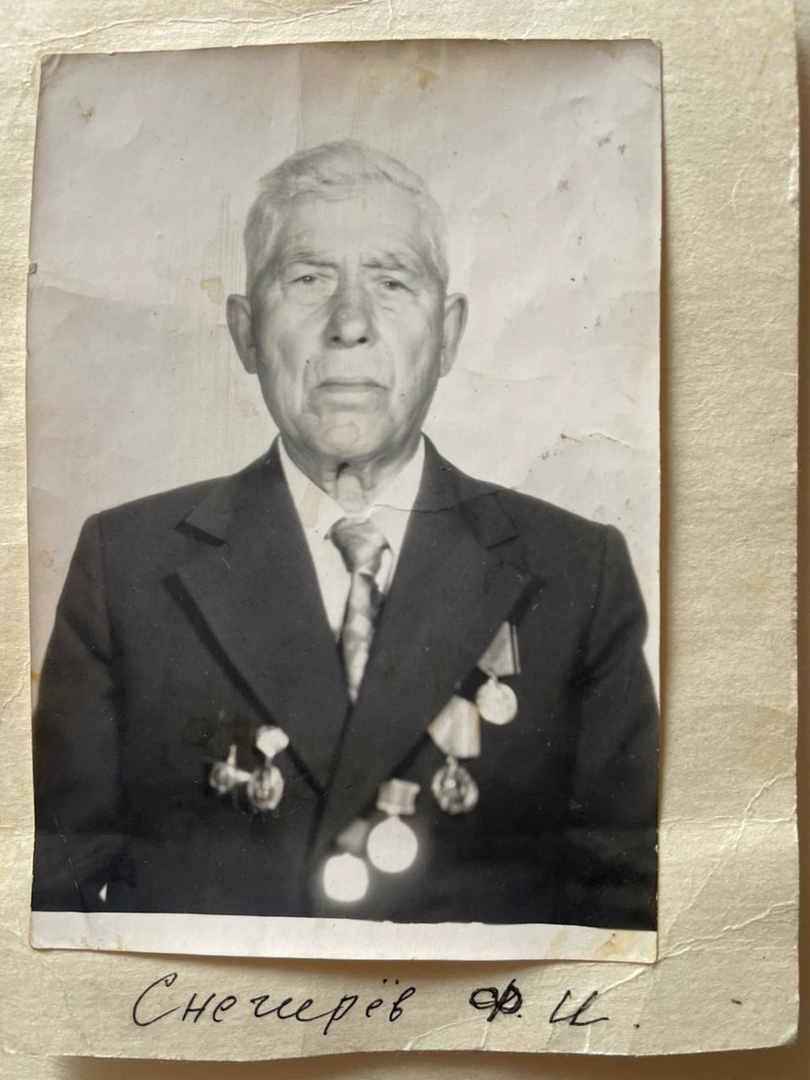 Снегирёв Фёдор Ильич, родился в 1902 году в небольшой деревне Малая Ивановка Щигровского уезда Курской губернии в крестьянской семье Ильи Степановича и Елены Ивановны Снегирёвой, вторым из пятерых детей. Фёдор Ильич рассказывал о своих родителях младшему сыну, что они были простыми крестьянами, которые всю жизнь пахали, имели одну лошадь, плели лапти, жили при лучинах. После службы в армии, Фёдор Ильич покинул родную деревню и перебрался в город Сумы, где работал в милиции, дослужившись до звания капитана. К началу ВОВ Фёдор Ильич с супругой и двумя детьми проживал уже в Черемисиновском районе Курской области (возможно в с. Старые Савины), откуда в сентябре 1941 года и ушёл на фронт, где воевал в составе 217-й стрелковой дивизии. Ему суждено было пройти долгий военный путь от родной Курской области до освобождения Польши. Во время ВОВ он несколько раз был ранен, но всё равно возвращался в бой, героически защищая своё Отечество. Приказом от 14 января 1945 года Фёдор Ильич Снегирёв был