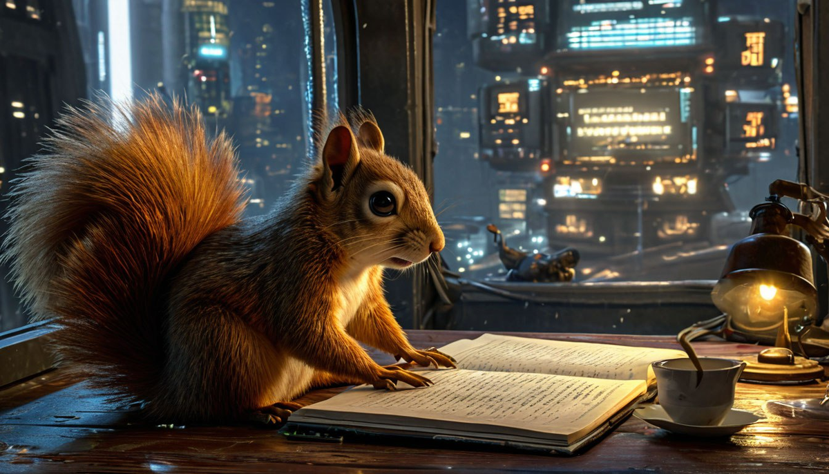 В глубине векового дуба, заваленного скорлупой и сушеными грибами, жила белка по имени Люся. Не та белка, что целыми днями гоняет шишки, а та, что мечтала покорить Голливуд. Её дупло напоминало филиал космического центра: ноутбук на пеньке, «доска идей» из коры, испещренная надписями типа «ВЗРЫВ!» и «СУПЕР-ПОГОНЯ НА ЖЁЛУДЕ!», а на полке стоял «Оскар», слепленный из глины и желудевых шляпок. Люся решила написать блокбастер про легендарных героев леса — Мишку, медведя-гения с аллергией на пчел, и Квакентину, лягушонку-киборга с голосом, похожим на скрип старой двери. «Итак, Мишка расследует исчезновение мёда, а Квакентинa… притворяется суперкомпьютером!» — бормотала Люся, стуча лапками по клавиатуре. Сюжет должен был быть эпичным: злодей-бобр построил гигантскую плотину, чтобы затопить лес, а герои спасают мир, используя мёд как топливо для квантового реактора. «И ещё роботы! — добавила Люся. — Нет, роботы-белки! С лазерами!» На доске появился новый стикер: «Белки-терминаторы???». Пробле
