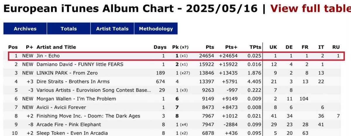 🔮 Альбом Джина "Echo" дебютирует на 1 месте в европейском чарте альбомов iTunes!
